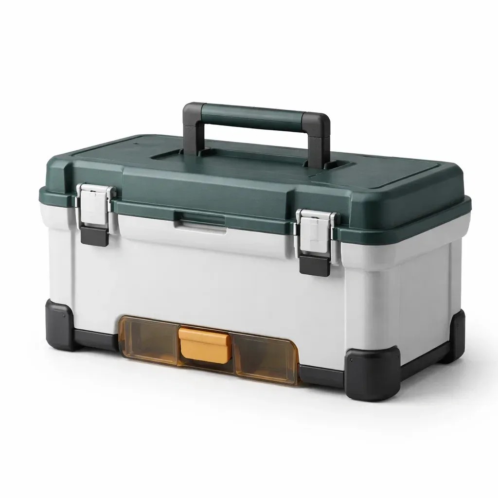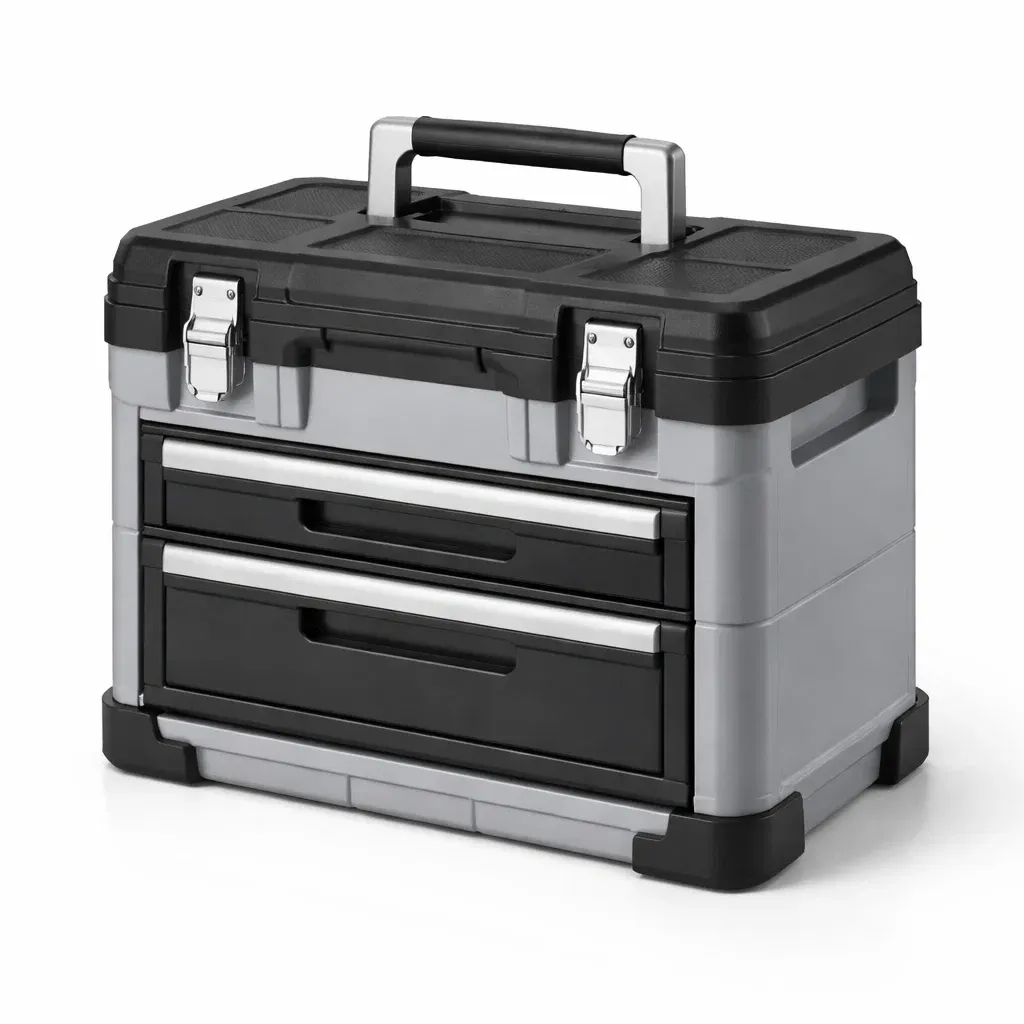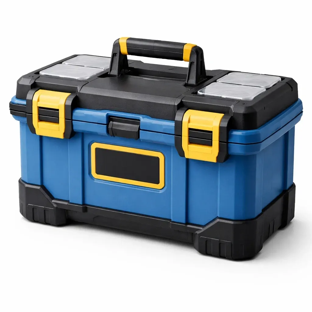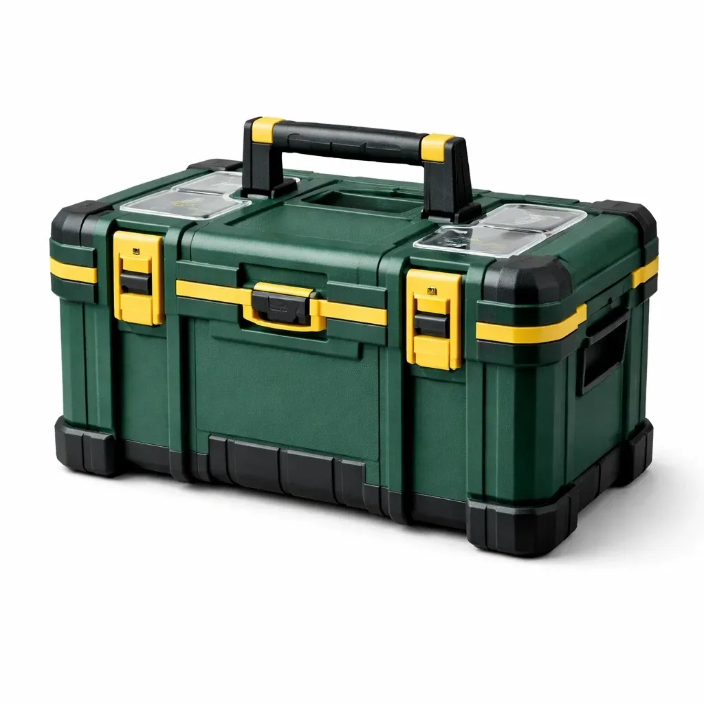 Cette série de boîtes à outils est conçue avec plusieurs compartiments de rangement, adaptée pour stocker différents types d'outils, facilitant l'organisation et le transport.