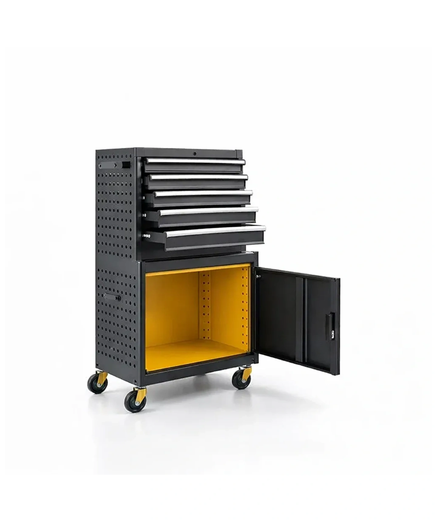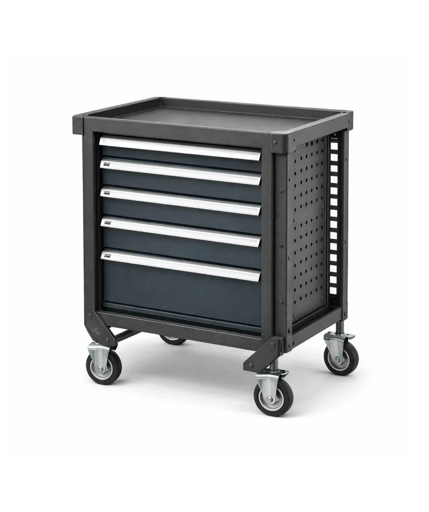Cette série de chariots à outils comprend plusieurs tiroirs et espaces de rangement pour stocker divers outils, facilitant l'organisation et l'accès.
